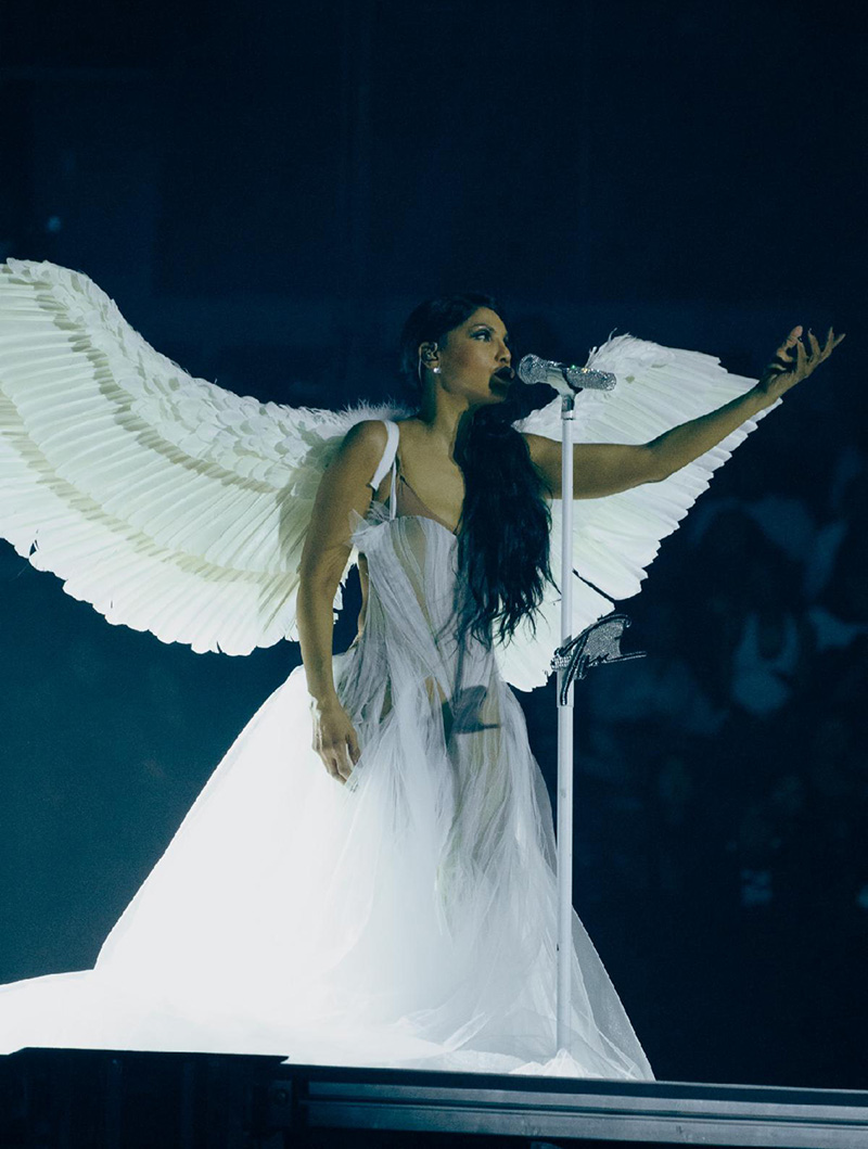 Toni Braxton made her grand entrance via riser, electrifying the crowd from the moment she appeared. From her flawless vocal delivery on hits like “Breathe Again” and “Just Be a Man About It” to every detail of her visual presentation, Braxton commanded the stage. Her stunning costume changes — from shimmery gowns to angelic regalia — punctuated the evening, keeping the spectacle as dynamic as the music itself. Adding to the night’s surprises, Braxton brought out social media influencer and journalist Kayla Nicole for a special cameo during the Los Angeles stop — a full-circle moment that came months after Nicole went viral for recreating a scene from Braxton’s Grammy Award-winning “He Wasn’t Man Enough” music video for Halloween, sending the crowd into a frenzy.