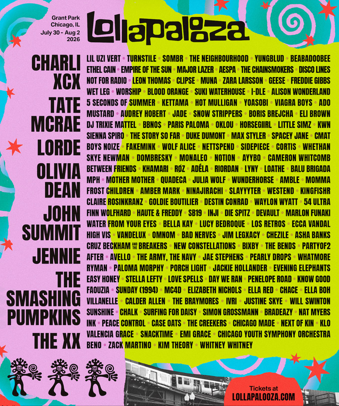 Charli xcx, Tate McRae, Lorde, Olivia Dean, John Summit, JENNIE, The Smashing Pumpkins and The xx are set to headline Lollapalooza 2026, which will also feature performances by Lil Uzi Vert, Turnstile, Sombr, The Neighbourhood, YUNGBLUD, Beabadoobee, Ethel Cain, Empire Of The Sun, Major Lazer, Zara Larsson, and much, much more. The legendary annual celebration of music takes place July 30-August 2, with more than 100 artists on eight stages, delivering four full days of music and interactive programming in Chicago’s crown jewel, Grant Park.